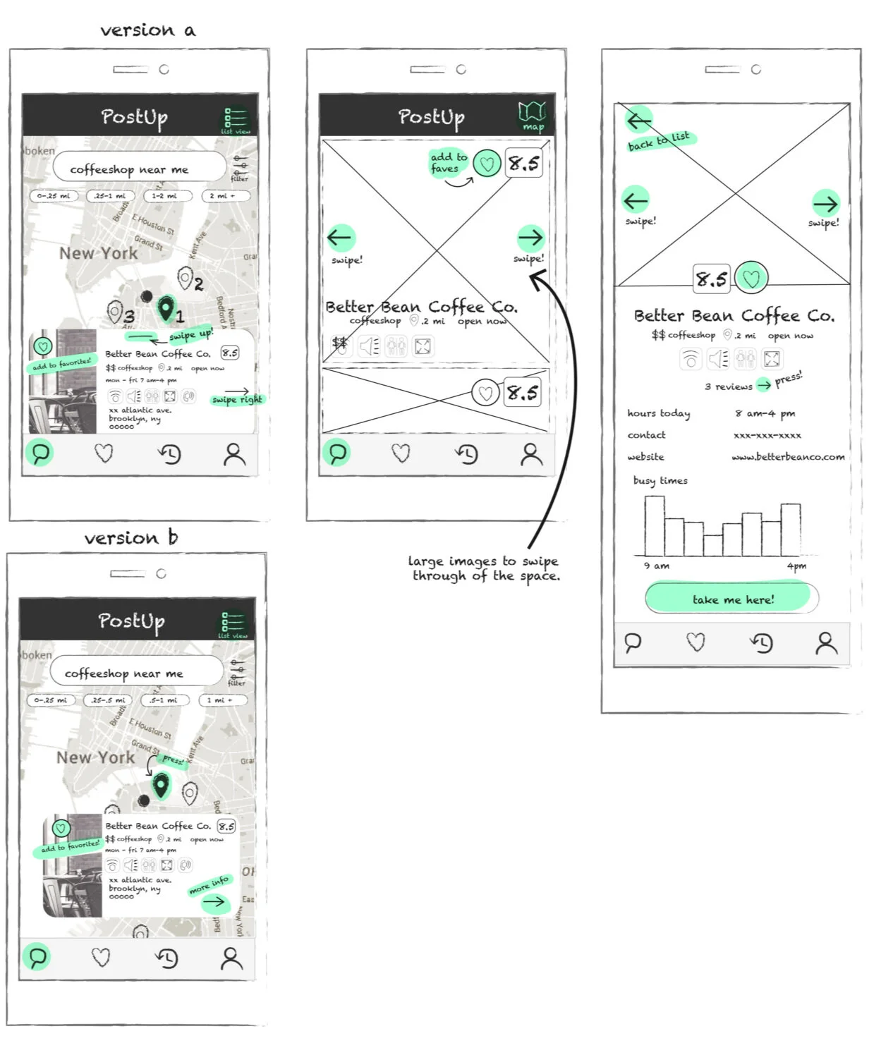I started with a map search, and highlighted proximity below to the search window. I made two versions of the map views…Version A has numbered map markers with a swipe screen that shows you the work spots in order by proximity. Version B shows map markers that are clickable/pressable to give an overlay with details of the coffeeshop/postup spot. I’d like to do some A/B testing to see what users prefer.